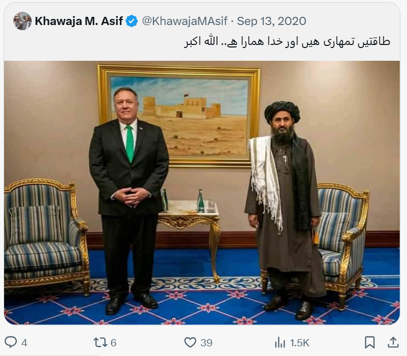 Former Pakistani Foreign Minister and current Defense Minister Khawaja Muhammad Asif shared this image with the Urdu caption: “Power is yours, but God is ours… Allahu Akbar,” framing the Taliban’s return as a religious victory.
